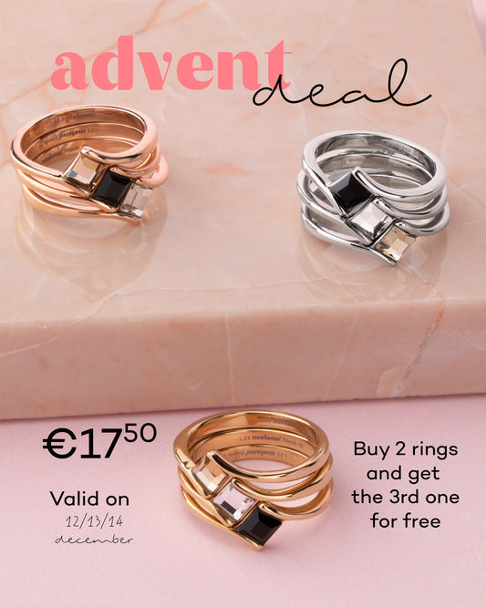 De Advent Deal 12, 13 & 14 December (3e ring GRATIS) is alléén dit weekend verkrijgbaar en bestaat uit de Friends Evy ring met maar liefst 40% korting! Alsof dat nog niet genoeg is, ontvang je ook nog eens de derde ring gratis. Scoor er één voor jezelf en geef de andere twee cadeau aan een geliefde tijdens de feestdagen.