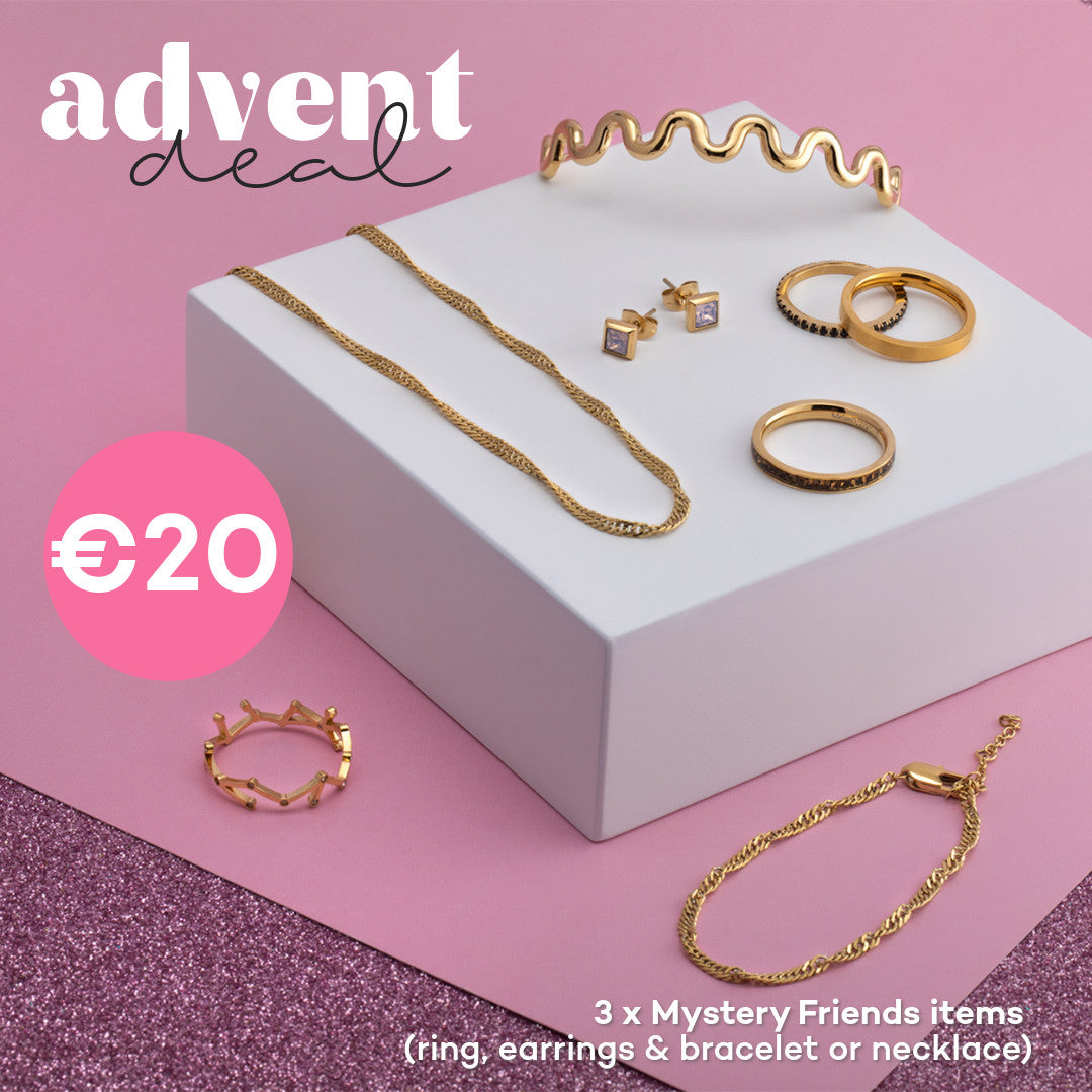 The Advent Deal for December 24, 25, 26, 27 & 28 - MYSTERY BOX is available only during the Christmas days and is a true mystery box! The exact contents remain a surprise, but we can reveal that you’ll receive at least 3 Friends items (a ring, earrings, and a necklace or bracelet) for the incredible promotional price of just €20. The Mystery Box is available in a silver, rose gold, or gold-coloured plating.
