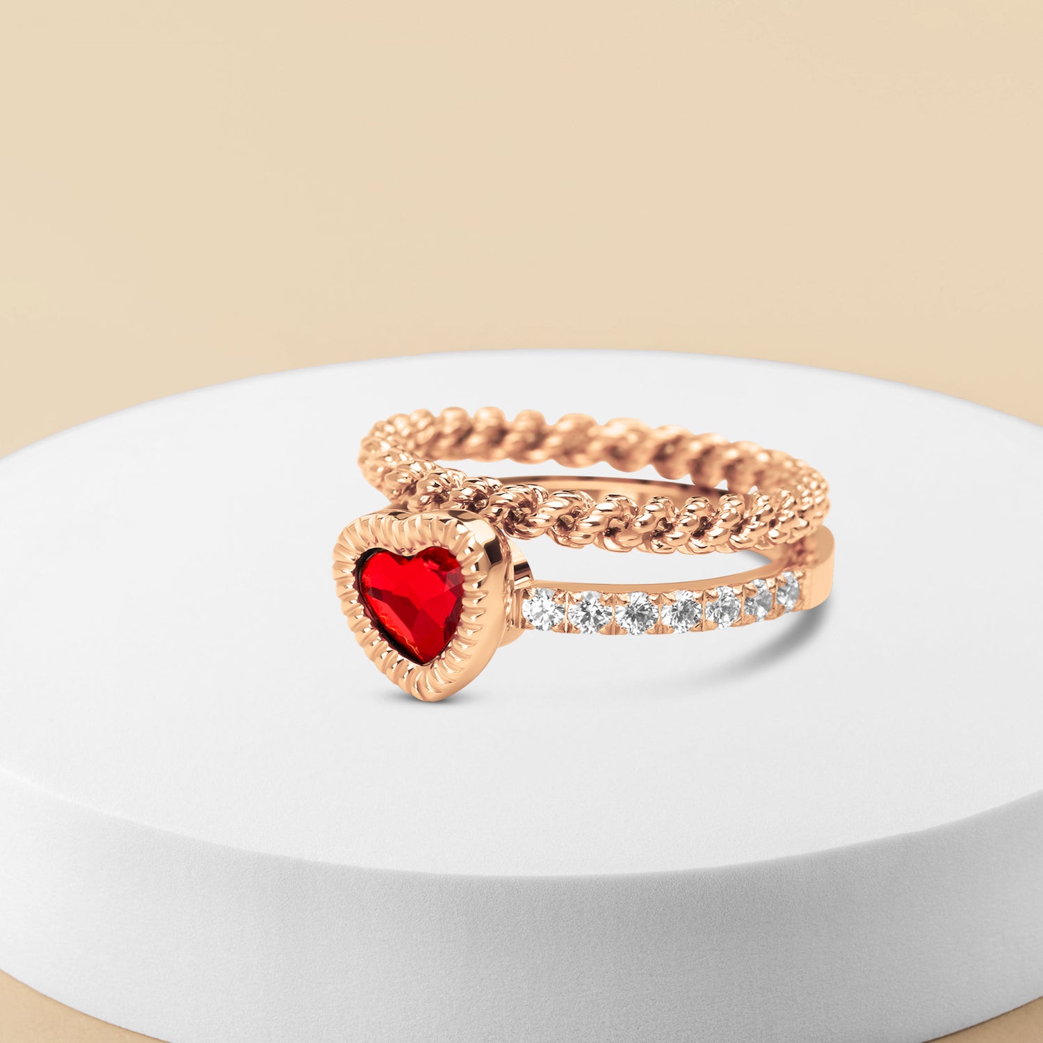 The Melano Friends & Vivid Sun After Rain ring set radiates hope and warmth. The heart-shaped garnet stone evokes the first rays of sunshine after a refreshing rain shower. The Sun After Rain ring set is available in a silver, rose gold, or gold-coloured plating and consists of: