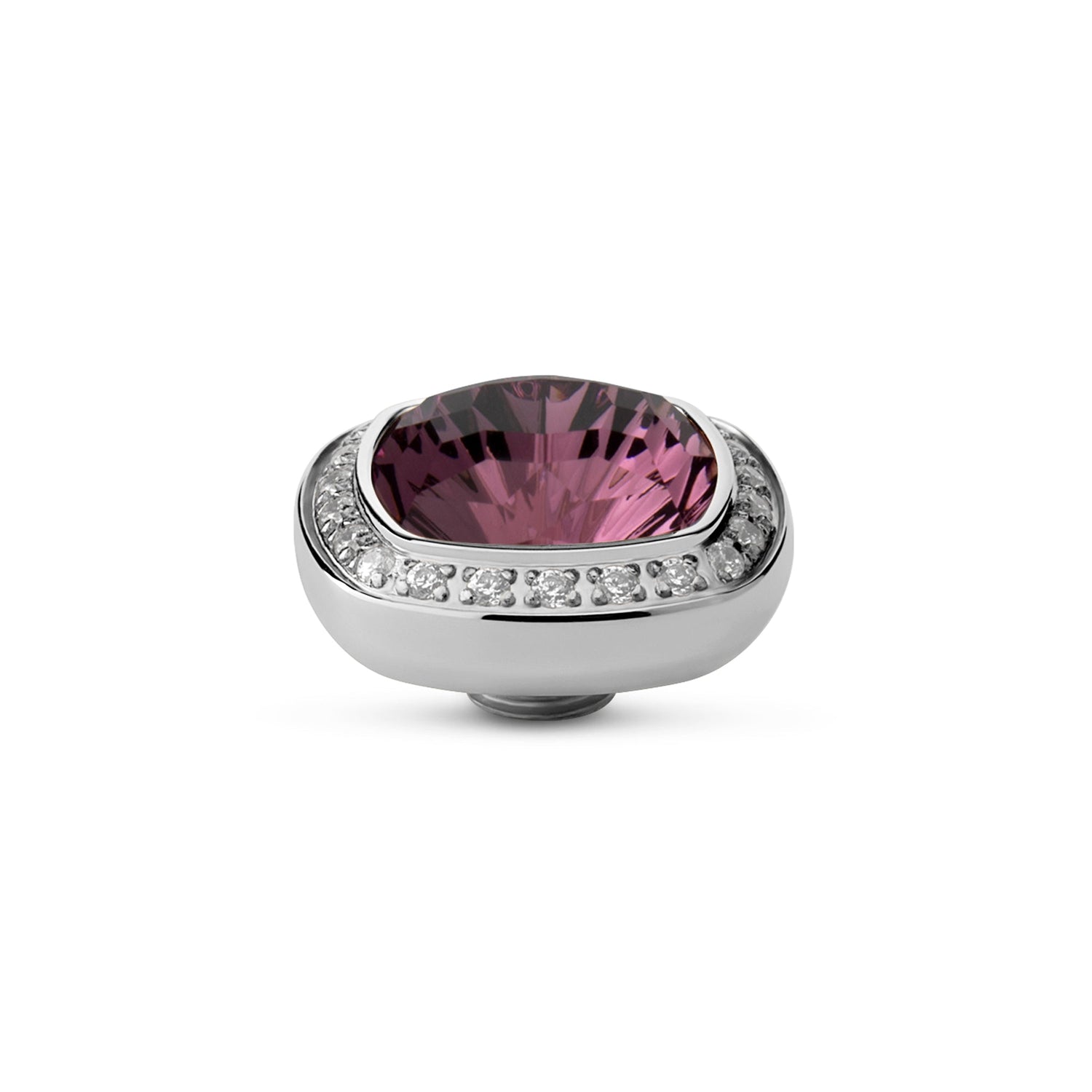 Het Melano Vivid Deluxe steentje heeft een kleurrijke zirkonia kern en een omlijsting van verfijnde kristalkleurige steentjes. Door de licht vierkante vorm en de gefacetteerde slijping straalt het steentje luxe uit. Het Deluxe steentje heeft een doorsnede van 12 mm en is verkrijgbaar in een zilver-, rose goud- of goudkleurige plating.